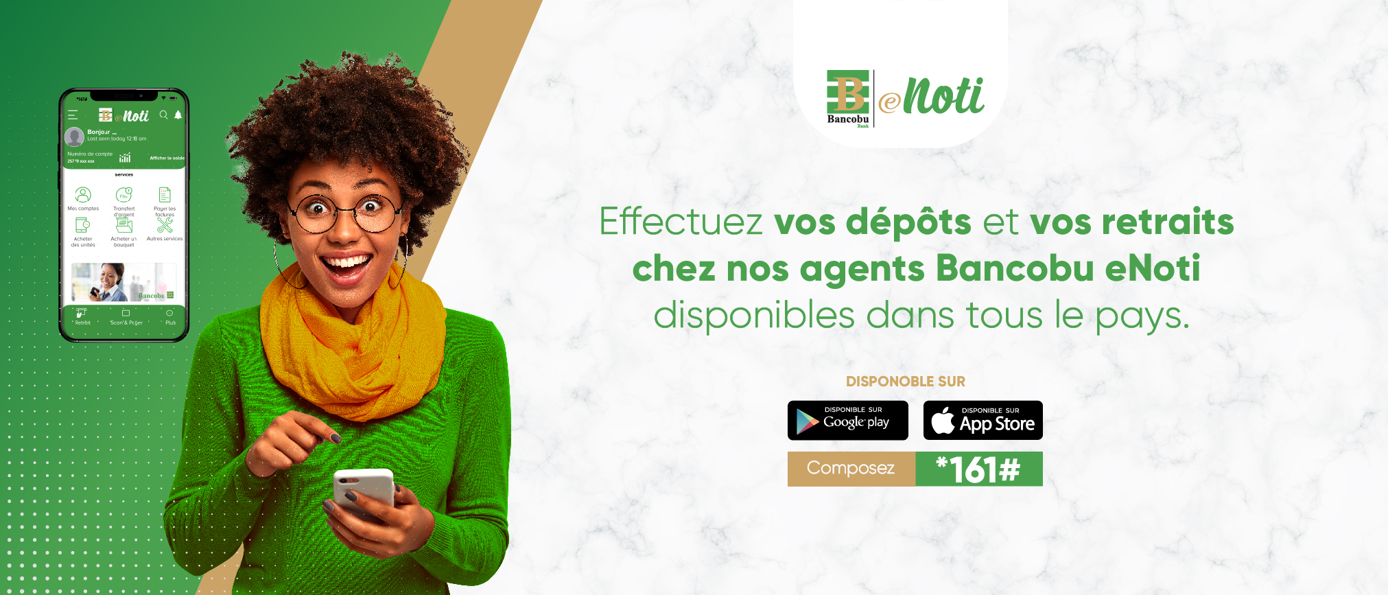 eNoti est un nouveau mode de paiement visant l'inclusion financière des communautés de base. Il permet les opérations de transfert de fonds, de dépôt, de retrait et d'épargne via l’empreinte digitale (biométrie) ou via le téléphone mobile. Ce produit est disponible sur tous les types de téléphones mobiles à travers les réseaux du Burundi. Nos agents répartis à travers le pays sont à votre disposition pour vous servir. Bancobu-eNoti : Banque Mobile, sur votre doigt ou votre téléphone mobile !